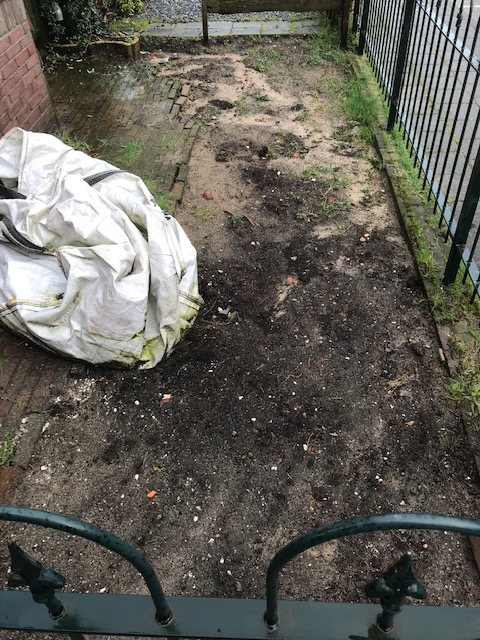 I have a dream for the front garden where it is full of plants, with bright pinks and yellows, and grasses and succulents, and a good tree on one side of it. Before I can come close to achieving that, the front garden needs to be cleared. That meant: removing paving to make space for plants, digging out the two box shrubs, removing the ugly yellow concrete planters on the sides, and getting rid of the bindweed (Dutch: haagwinde) as much as humanly possible.